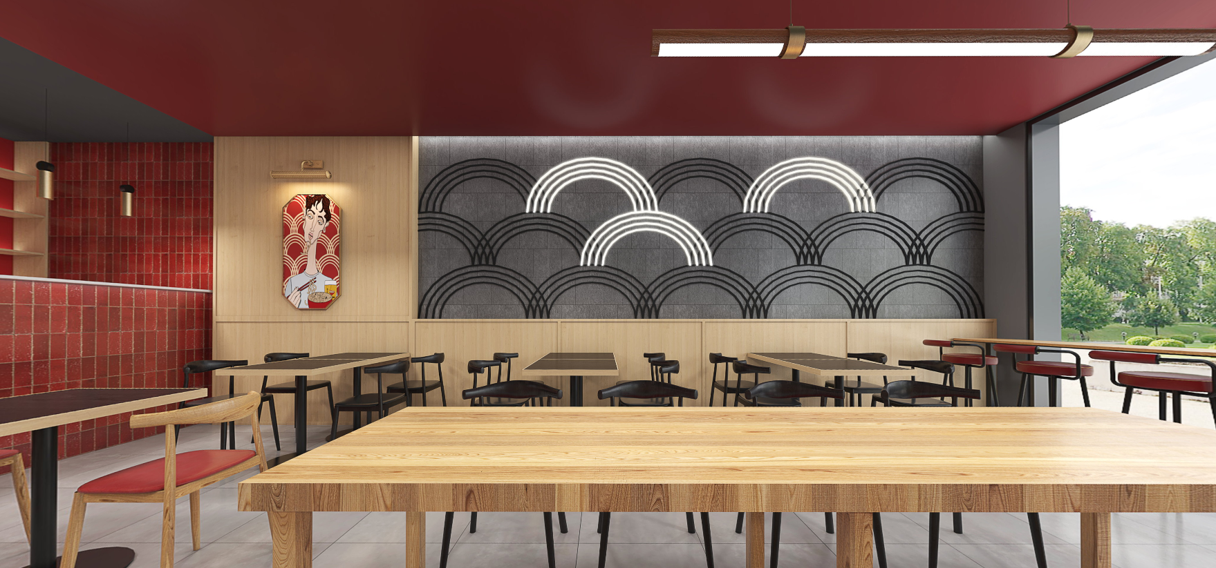 A Chinese noodle restaurant in London, highlighting the perfect balance between modern and traditional elements. The clean and minimalist overall tone of the restaurant is achieved through the use of natural wood and pops of red tile, while the standout feature is the graphic artwork on the walls, which provides a striking contrast to the traditional elements. The wooden tables and chairs add warmth and texture, and the red tiles on the walls and floors provide a vibrant splash of colour, creating a visually engaging environment that complements the food and drink on offer at the restaurant.