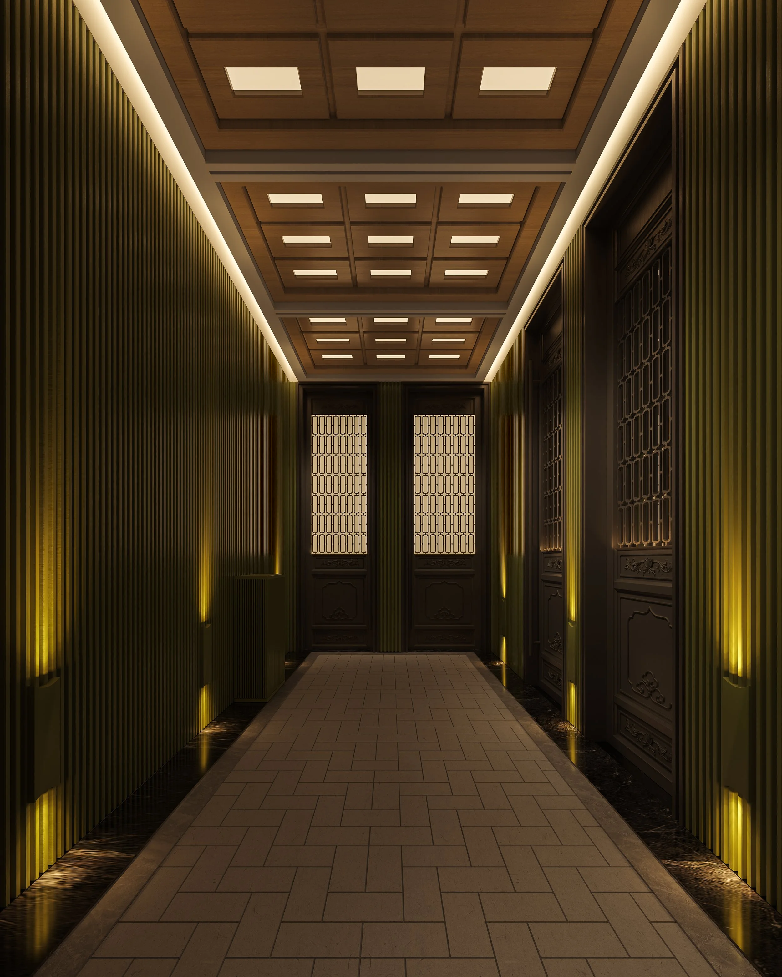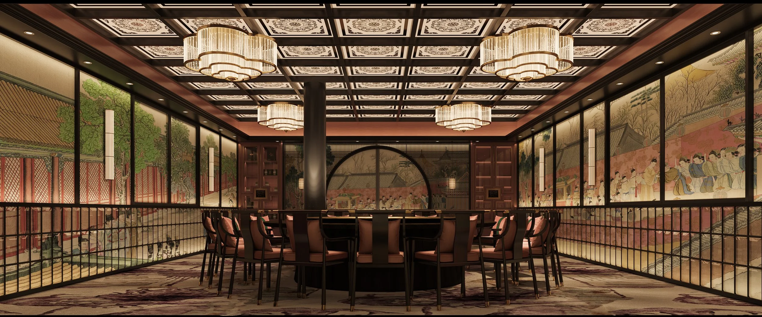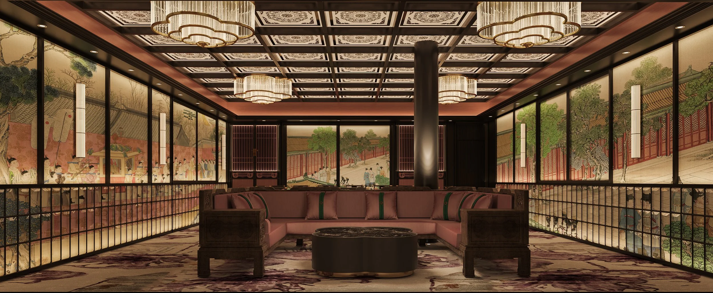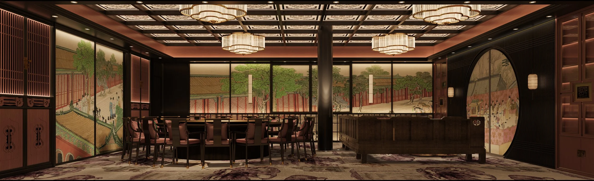 The private lounge in London boasts an oriental theme with a pink and green colour scheme, hand-painted Chinese artwork wallpaper, and large chandeliers in each room. The two rooms have distinct personalities; the pink room is plush with intricate Chinese decorations, while the green room is modern with sleek furniture. Chinese decorations can be found in the cabinets, and a large dining table with karaoke offers entertainment options. The design is stylish and functional, creating a luxurious and welcoming space for entertaining or relaxation.