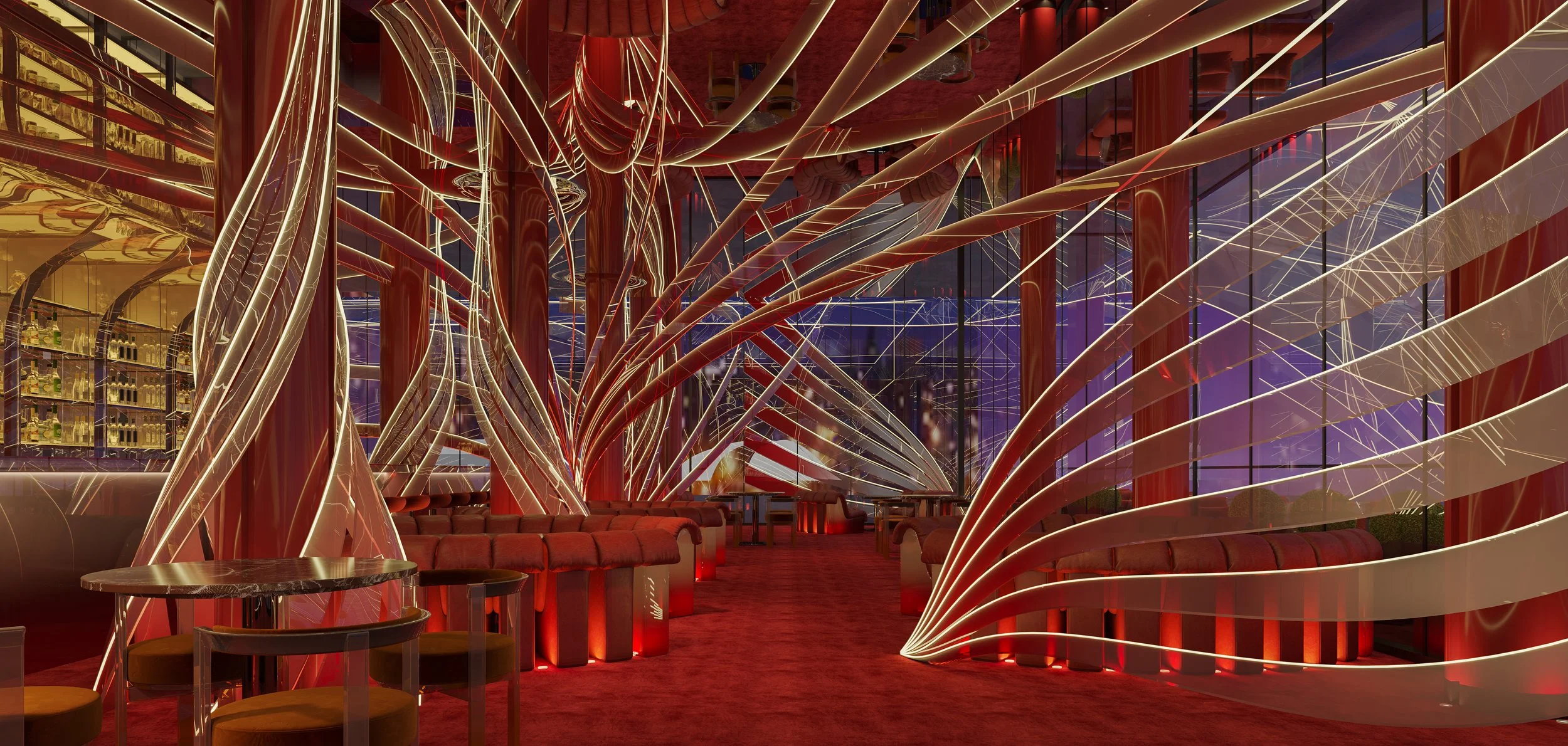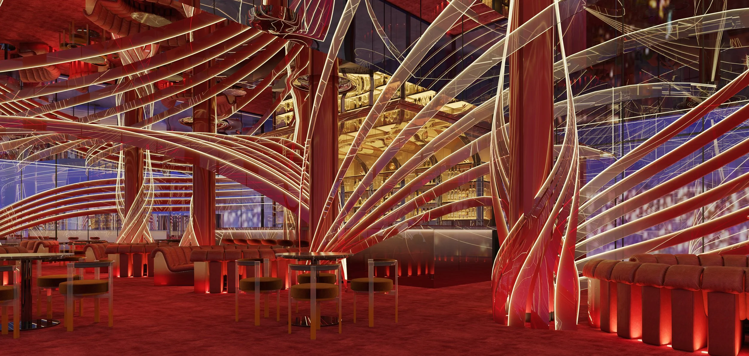 Quantum Bar, set in St. Paul’s, draws inspiration from the famous British landmark, St. Paul’s Cathedral. By employing next generation transparent photovoltaic solar glass, QB’s entire shell has the capacity to become a “vertical solar farm” – much like that of Bentley’s solar car park, Crewe, harnessing enough energy to more than satisfy consumption. Transparent curved branches emanate from QB’s roof, in a spherical fashion to offer unobstructed views, add visual interest, and convert the maximum yield of solar power, whilst emulating the majestic architectural dome of St Paul’s Cathedral.